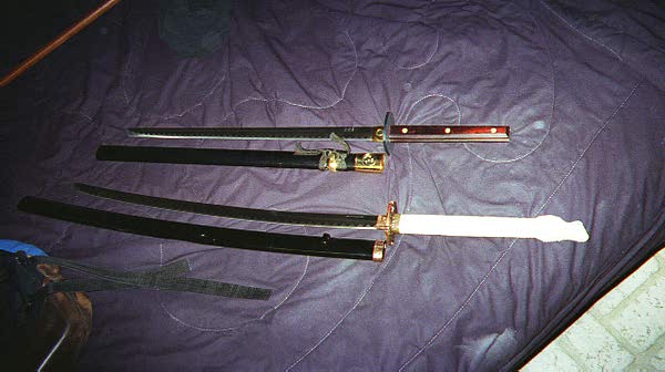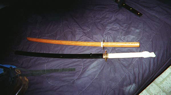 16 Rosewood (?) Bodoken and my Dragon Katana. Master's Ninjatu sneaking into shot as well as backpack. Peeking into the shot is an example of my tile floor. | ![]() |